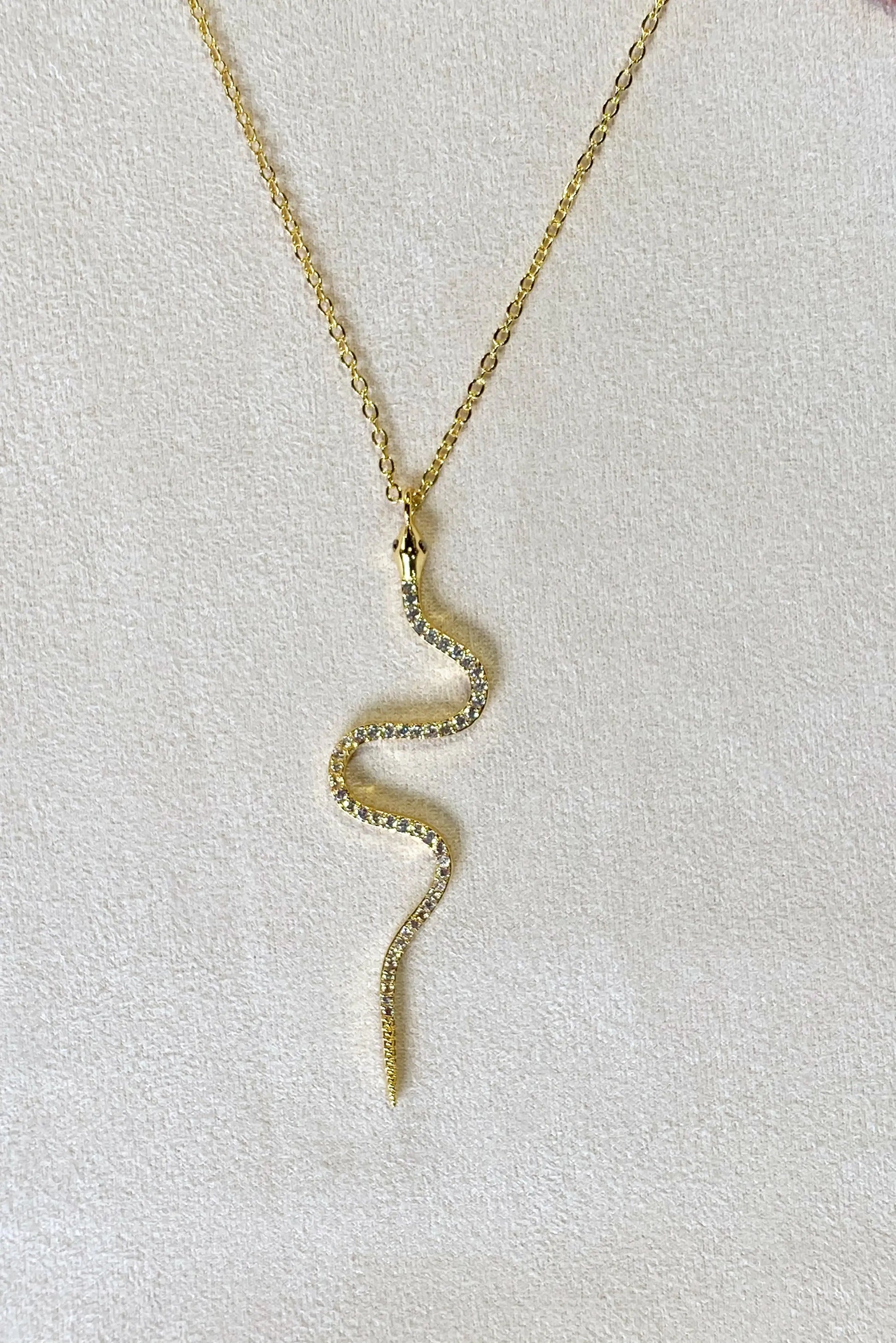 Slim and chic snake pendant necklace. Clean snake shape with clear cubic zirconia stones.